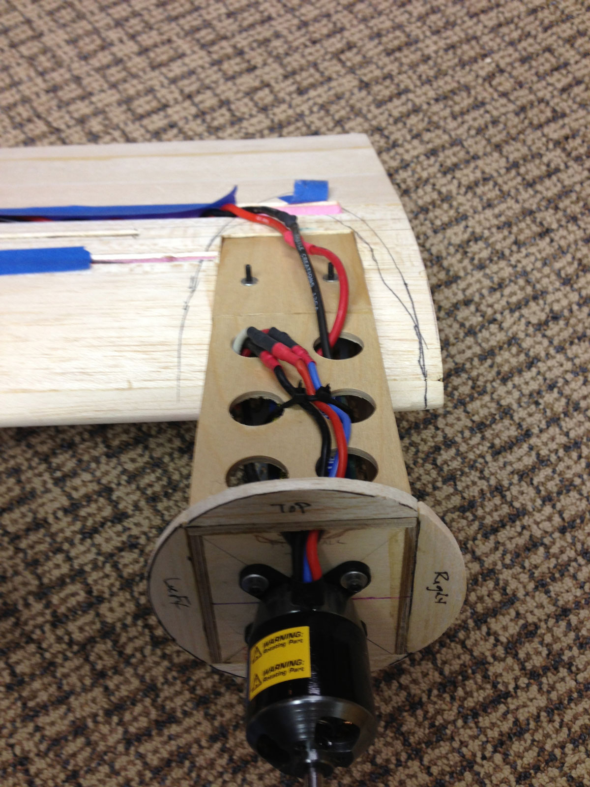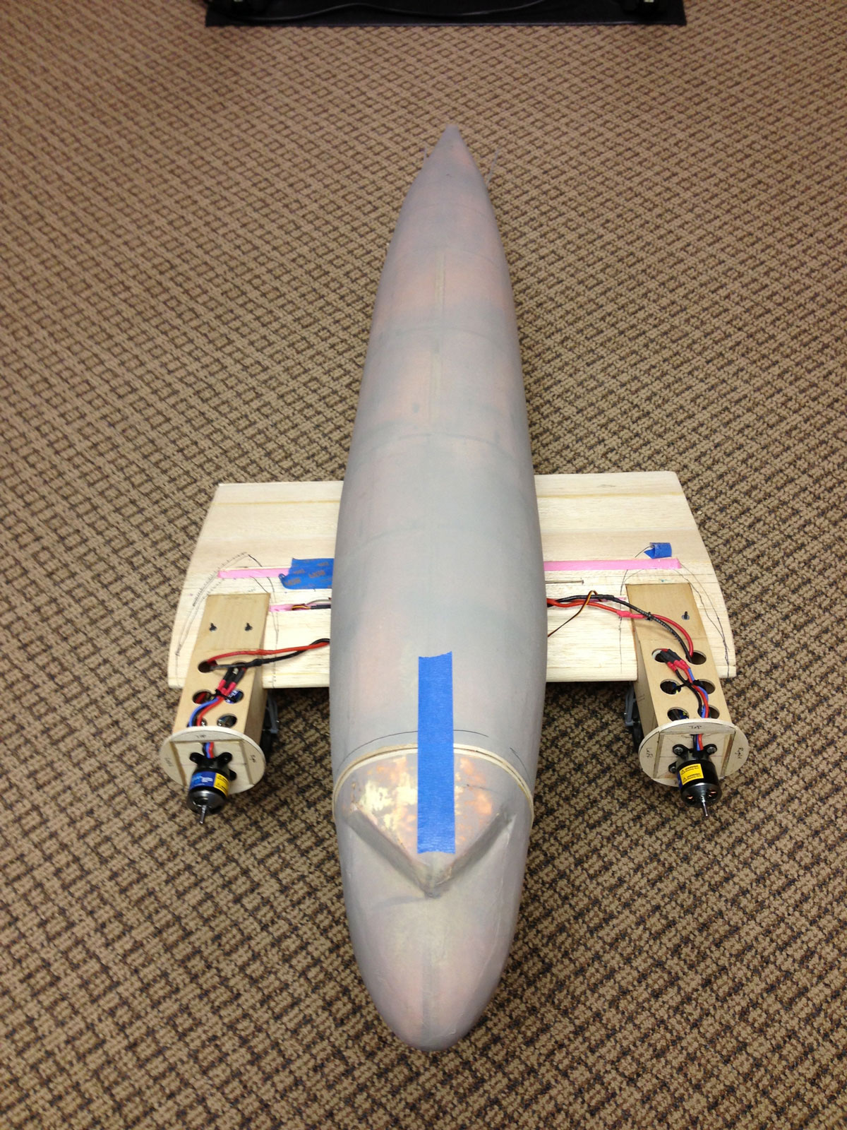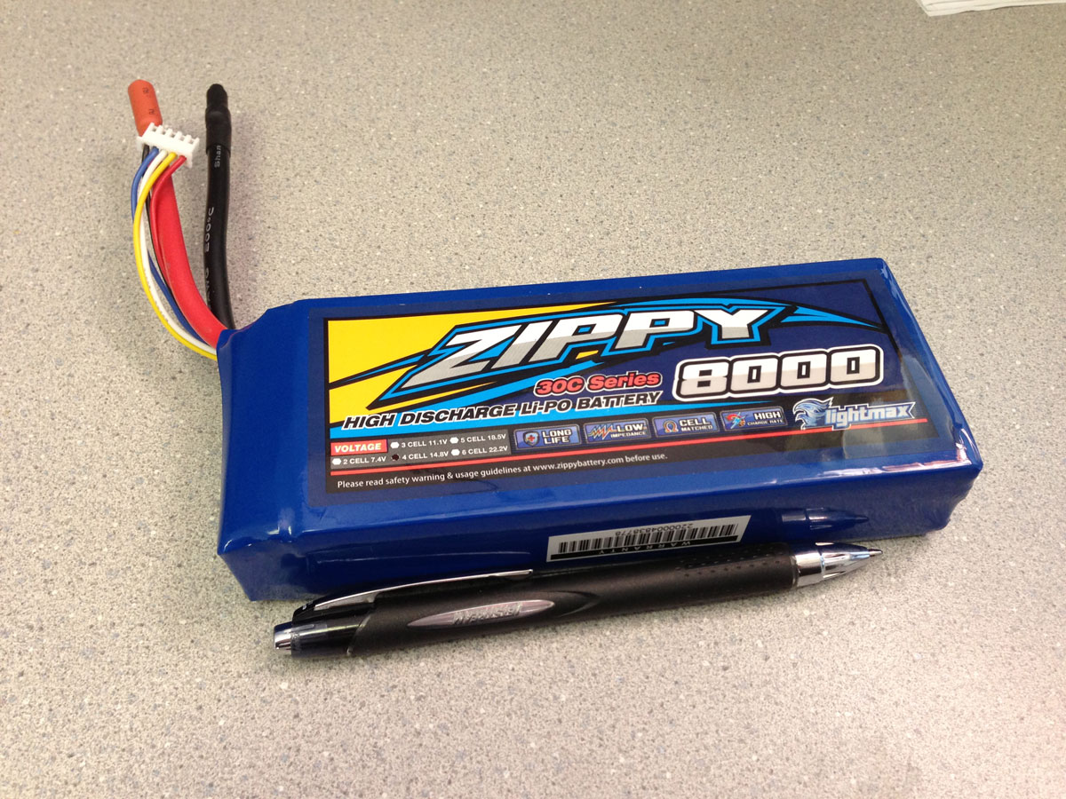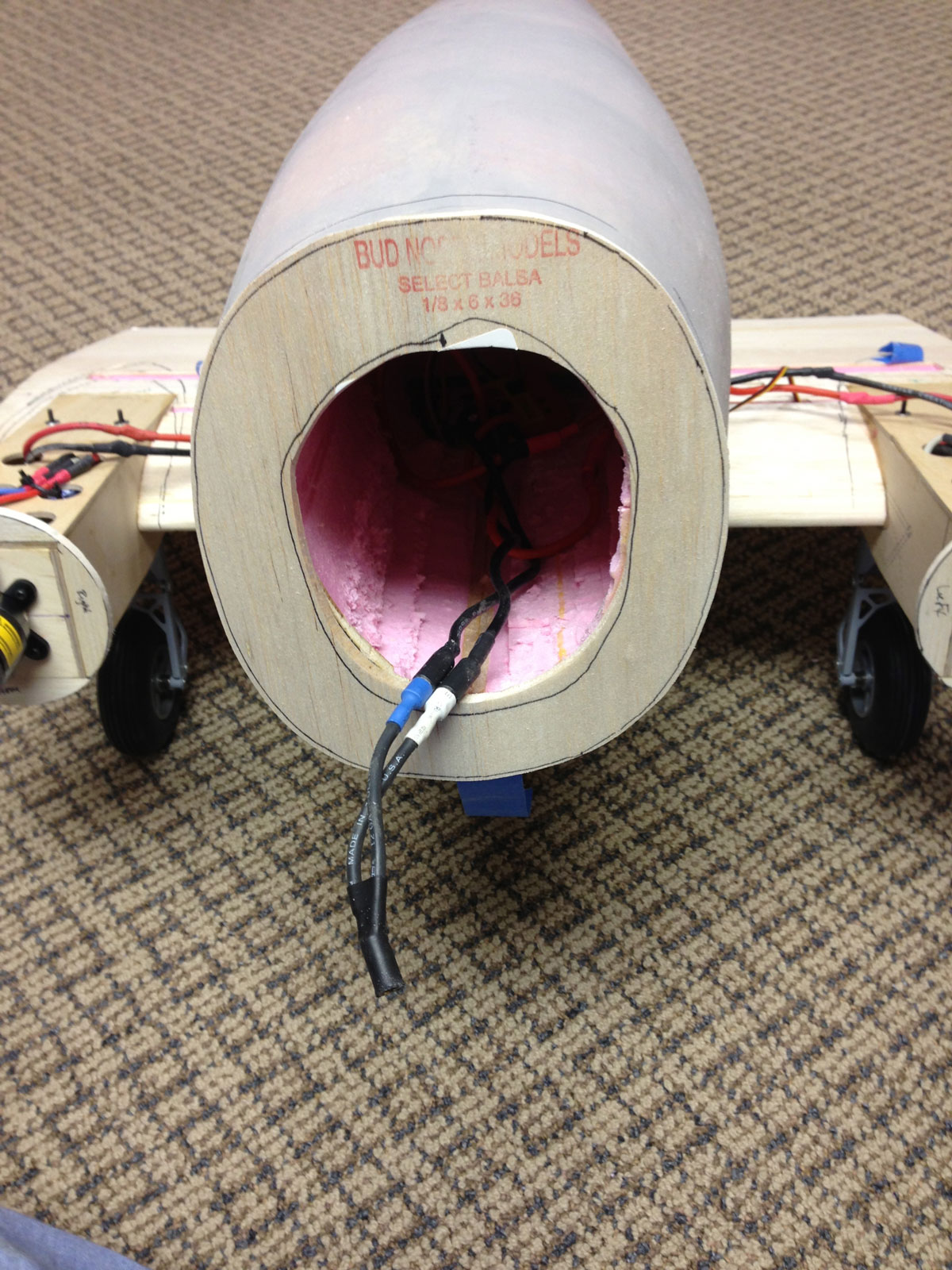 You will notice in the pictures that I cut off the nose of the plane as this will be accessed for battery charging. I have a Zippy 30C 8000 4 cell lithium polymer battery that will power the electric twin motors. The picture included in this post shows a roller-gel pen next to the battery so you can see the size. I will be making a battery tray to lay inside the forward area of the fuselage where you see the wires hanging out. The nose will be secured during flight with magnets and alignment will be helped with dowel pins.