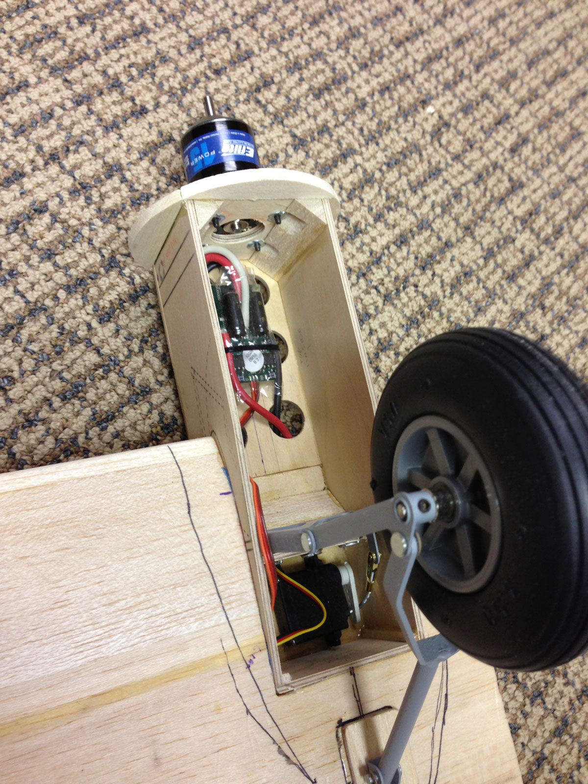 The wing center section is a beast. It is mechanically complete but it needs to be cleaned up and the wires need to be buried . The engine nacelle framework house the speed control for each engine, retractable landing gear and servo to operate the gear. It is crowded but it fits! Progress on the engine nacelle covers will happen in the next month or two. Once that is complete, final assembly and paint will finish her up so she will be ready to fly.